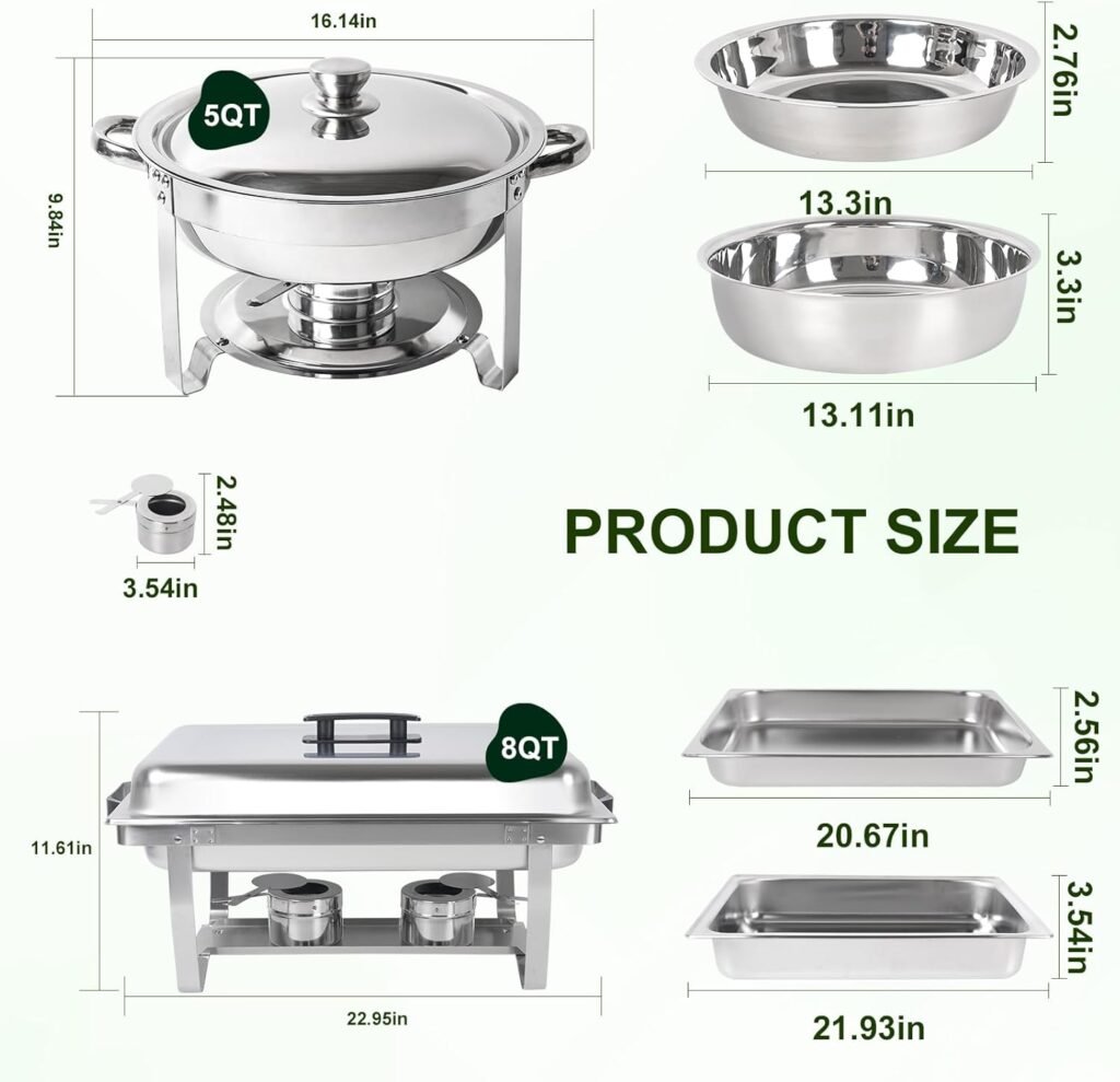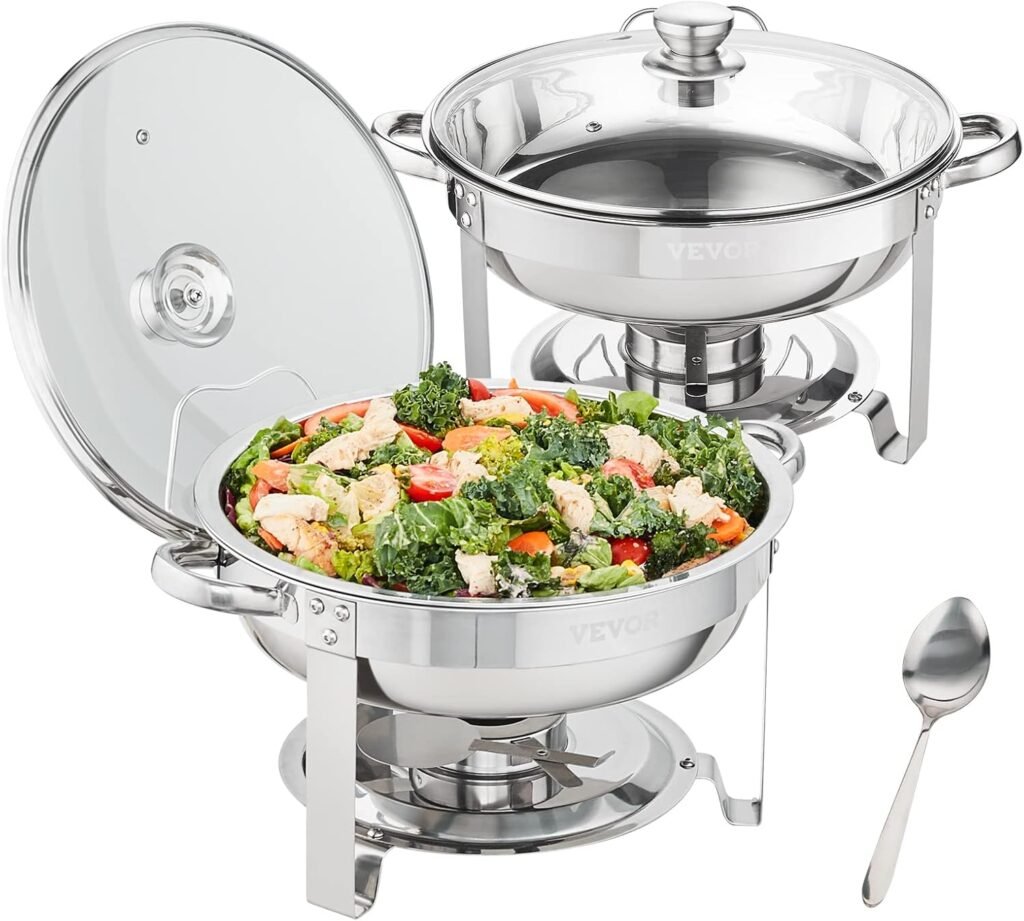 VEVOR Chafing Dish Buffet Set, 4 Qt 2 Pack, Stainless Steel Chafer w/ 2 Full Size Pans, Round Catering Warmer Server w/Vented Glass Lid Water Pan Stand Fuel Holder Hook Spoon, at Least 4 People Each