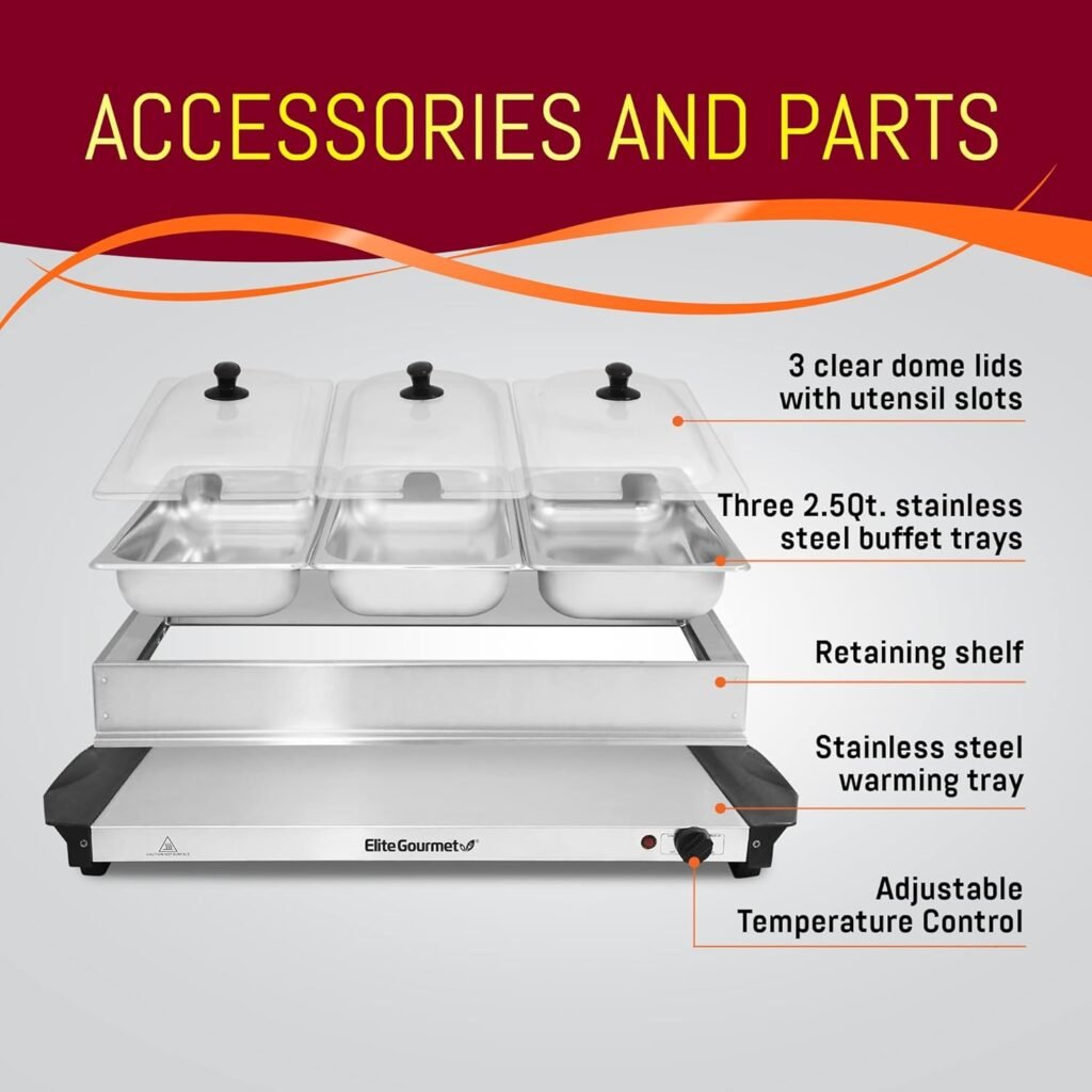 Elite Gourmet EWM-6171 Triple 3 x 2.5 Qt. Trays, Buffet Server, Food Warmer Temperature Control, Clear Slotted Lids, Perfect for Parties, Entertaining & Holidays, 7.5 Qt Total, Stainless Steel