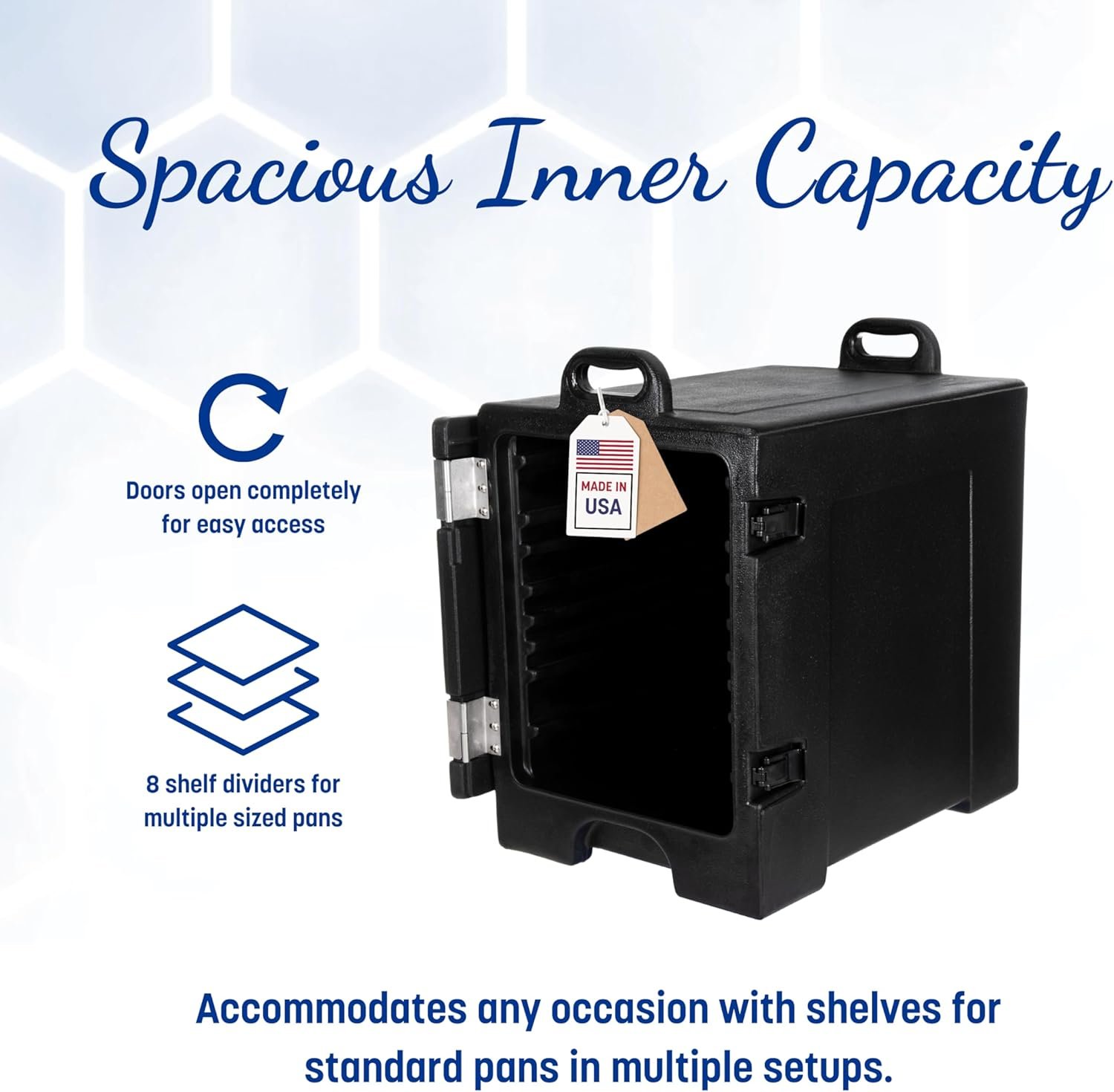 VERSATILE INTERIOR FOR FOOD WARMING AND TRANSPORT: Holding up to (5) 2.5″ full-size or (10) half-size food pans (sold separately), this front loading hot box is perfect for warming trays, steam pans, or sheet pans. It’s a must-have catering food warmer box for banquets, food trucks, and events that demand reliable temperature control.