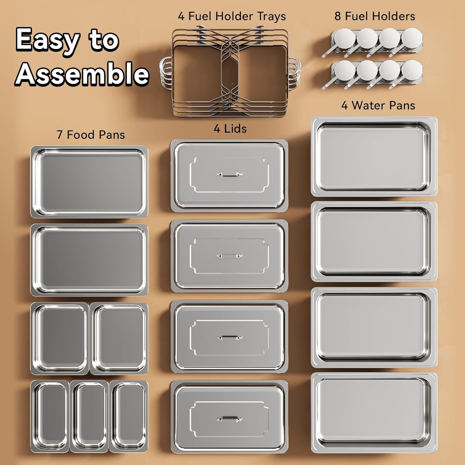 HIGH QUALITY STAINLESS STEEL: Our chafing dish is made of durable stainless steel, so it can maintain temperature better. Compared with other competing products, it has more stable legs and is not easy to deform. And this chafing dish buffet set has a longer service life.