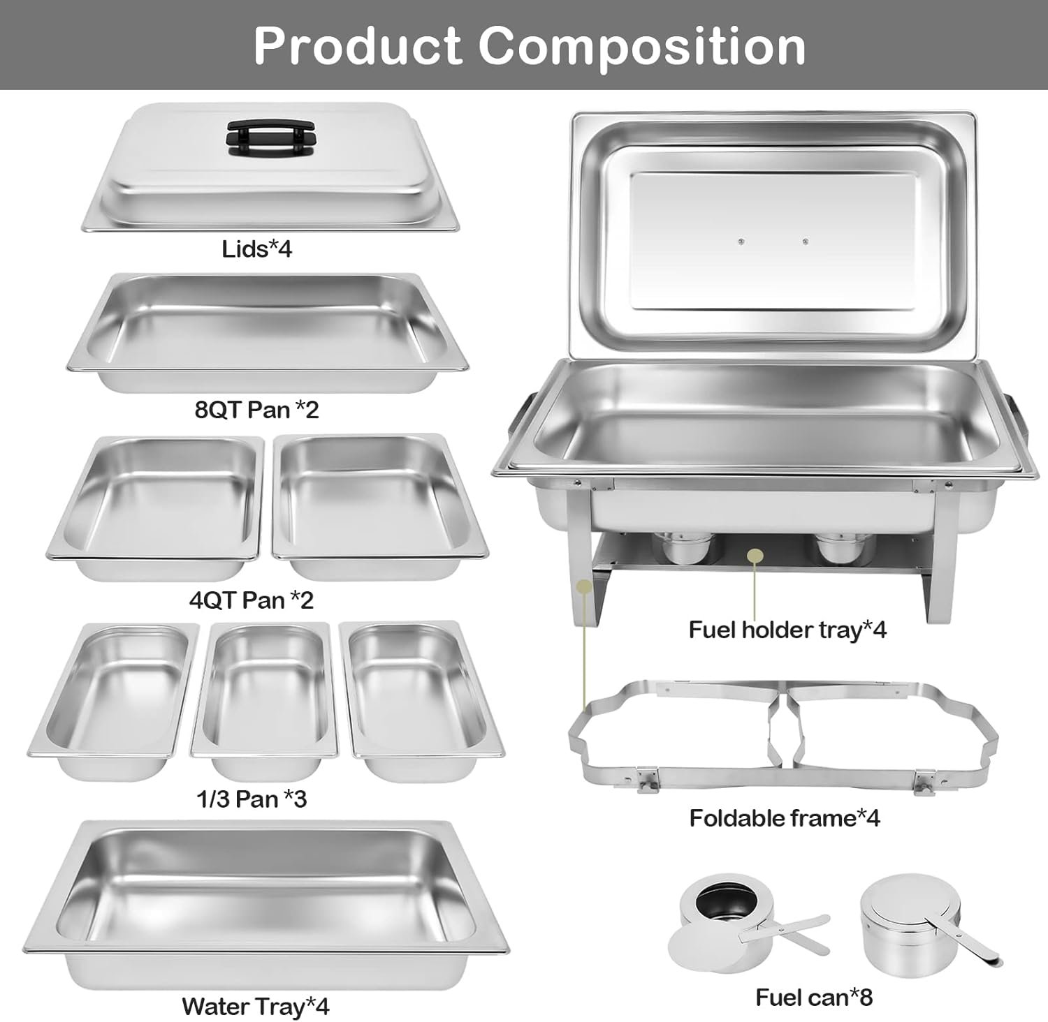 3 MODELS:【Model 1】 2*chafer sets come with 2*full size trays.【Model 2】 2*chafer sets come with 2*full size trays + 2*half size trays.【Model 3】4*chafer sets come with 2*full size trays + 2*half size trays + 3*1/3 size trays.Each chafer comes with common spare parts:Lid+Trays(according to the model you choose)+Water pan+Foldable frame+Fuel holder tray+Fuel cans*2.
