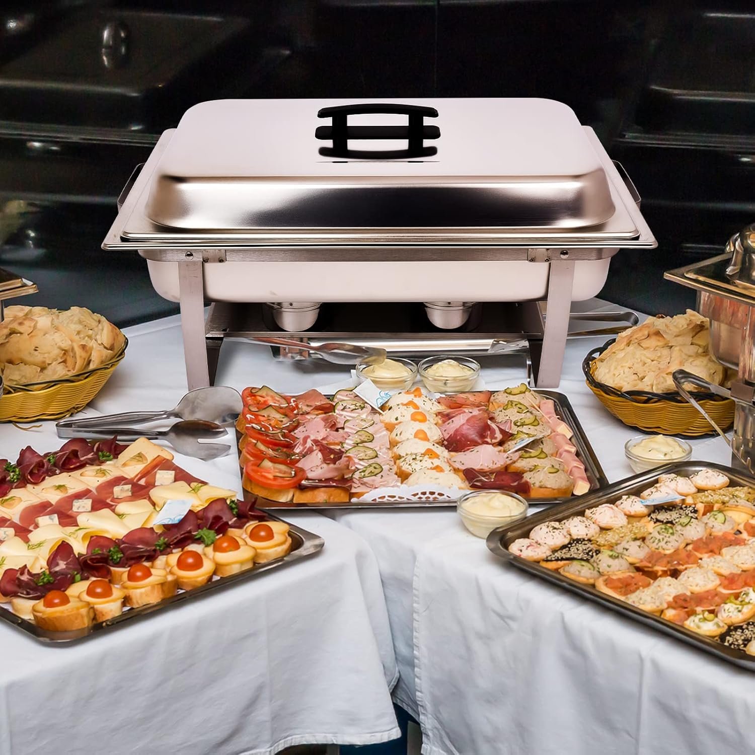 CHAFER BUFFET SET MATERIAL:Our chafing buffet set is made of high grade stainless steel good thermal conditivity to keep the food warm inside.Standard food industry material&human friendly.