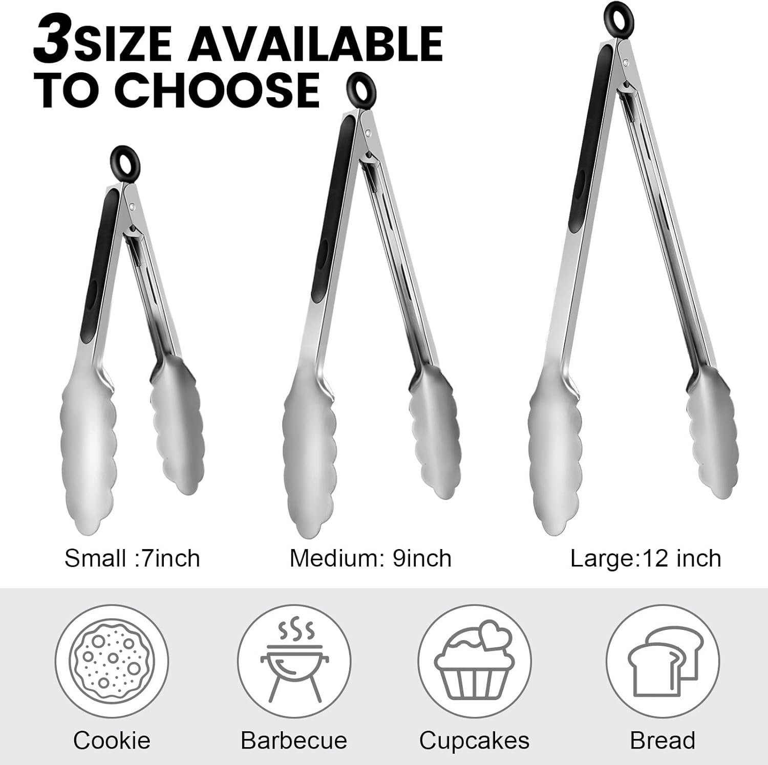 3 Sizes: these tongs for cooking come in 3 different lengths, including 7 inches, 9 inches, and 12 inches, so that the various sizes can meet your wide usages in daily life and bring you a lot of convenience