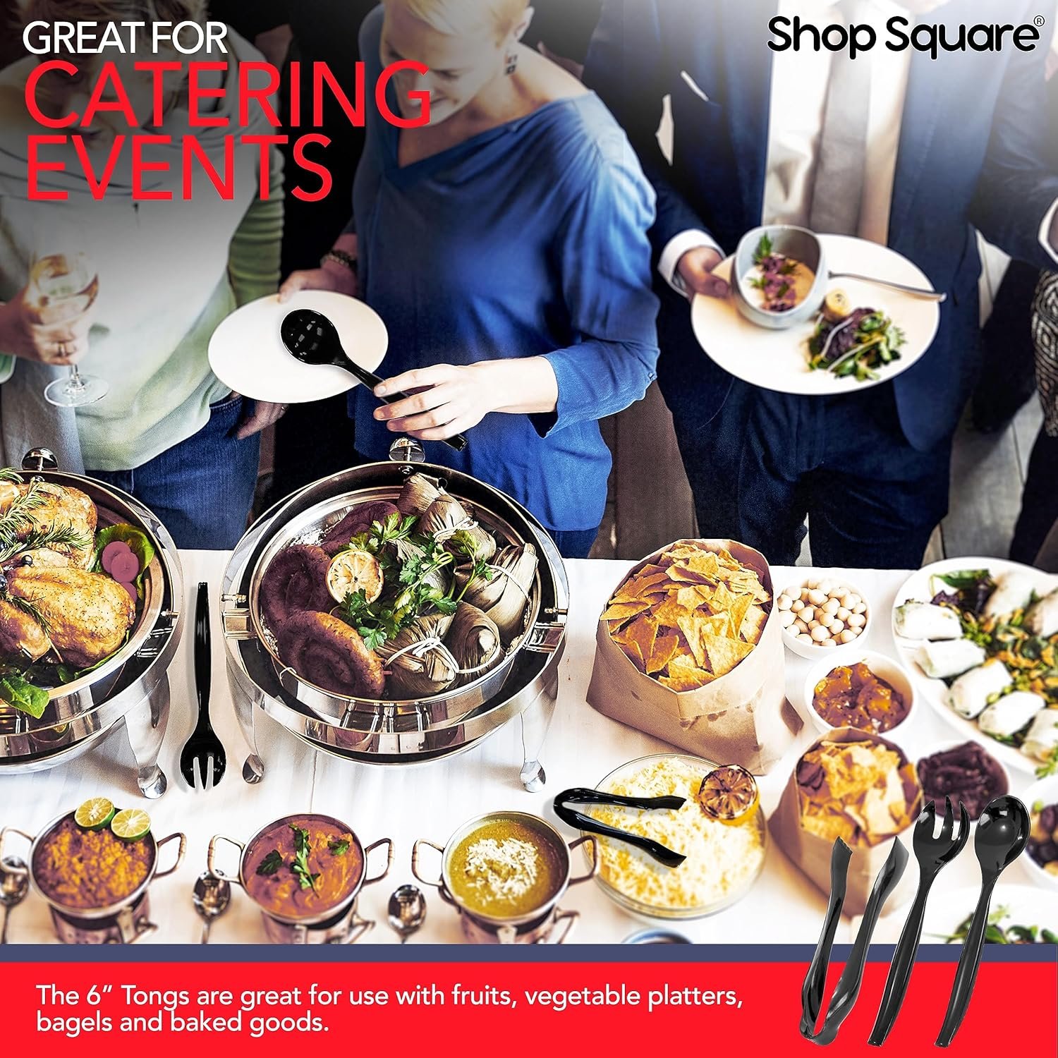 FULL SET OF SERVING TONGS, FORK, & SPOON – The 10” Forks & Spoons feature long handles for sanitary food service, making them perfect for pastas, salads, sides, and more. The 6” Tongs are great for use with baked goods, fruit & vegetable platters, bagels, etc!