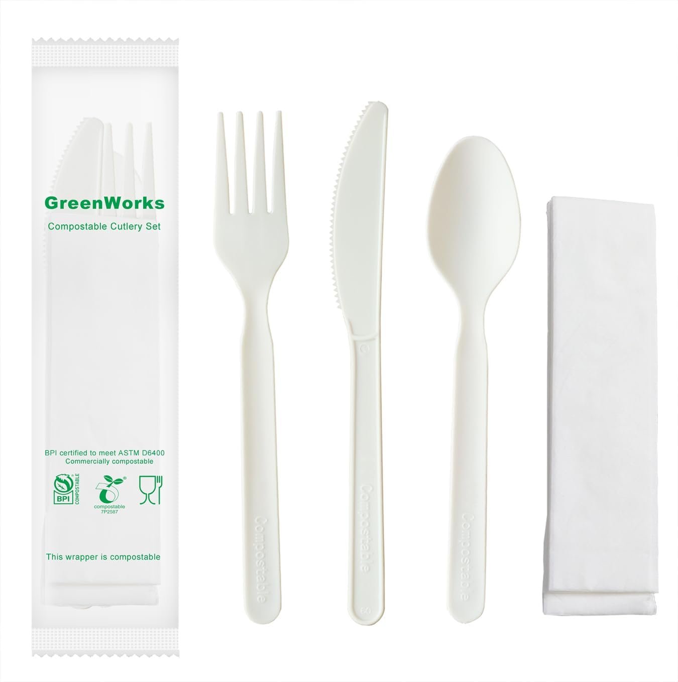 GreenWorks 7″ Heavy-duty Compostable Cutlery Kits, BPI Certified, 200 Sets (Fork, Spoon,Knife,Napkin 4 in 1) Individually Wrapped With Compostable Bags,Alternative to Plastic Disposable Utensils