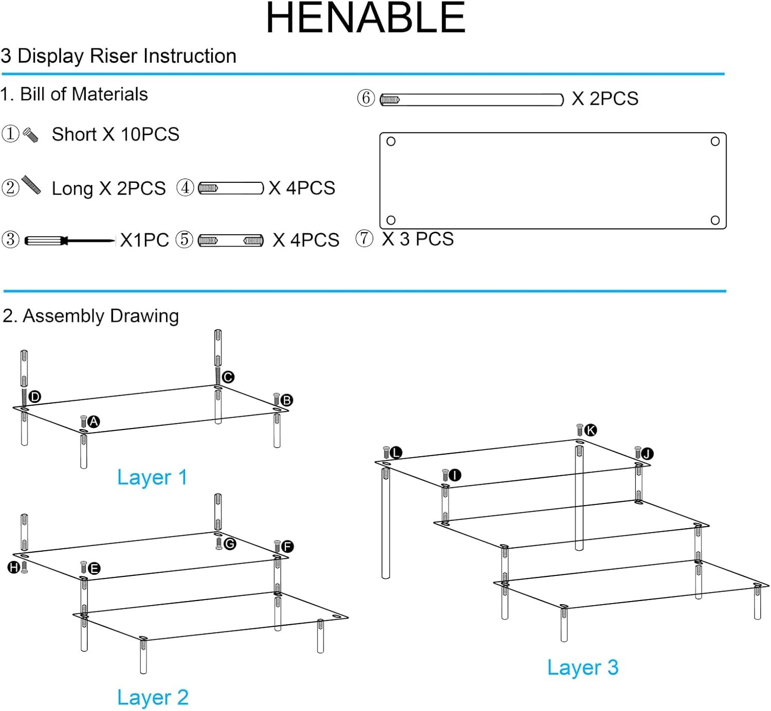 What You Get: Acrylic stand riser include 1 X 3-tier display stand, 1 X Phillips Screwdriver, 1 X Specification