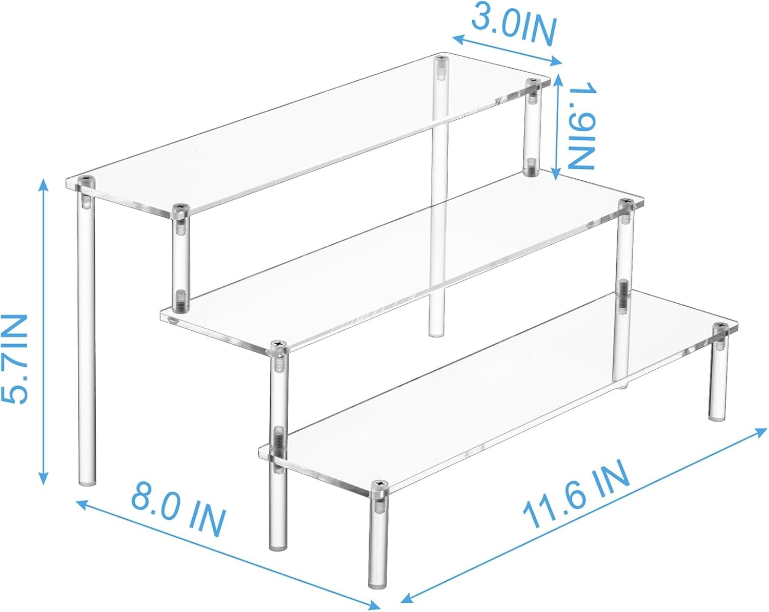 Display More Things: SIZE: Every acrylic panel is 11.6 IN long and 3.0 IN wide, the height of each tier is 1.9 IN, the total height is 5.7 IN. 3 tier cupcake stand is simple design and solid. Acrylic cupcake stand 3 tier features 3 layers that provides enough space to cologne perfume, cosmetic, skincare lotion, Amiibo Funko POP Figure, dessert, cupcake risers, collectibles and etc