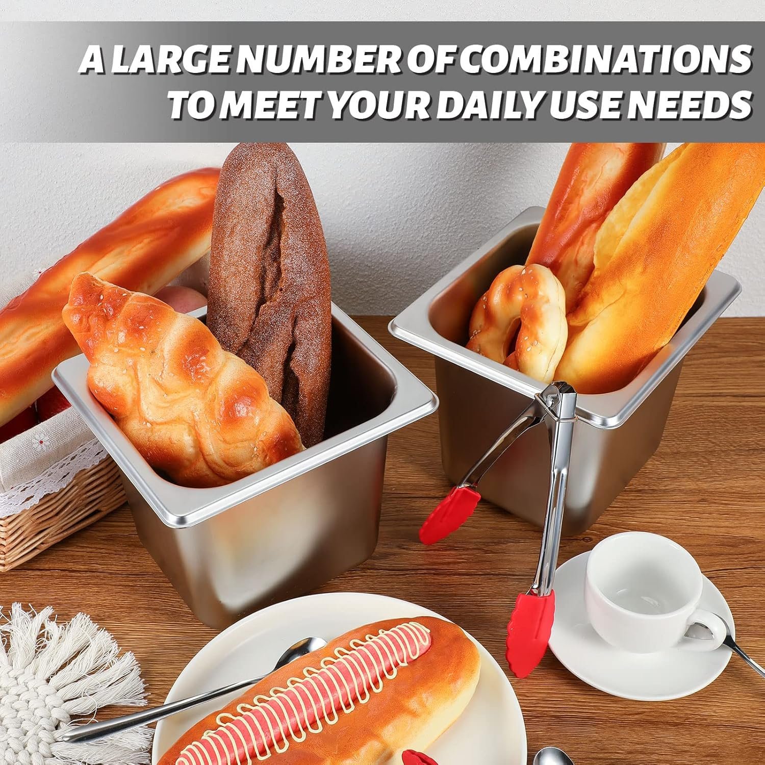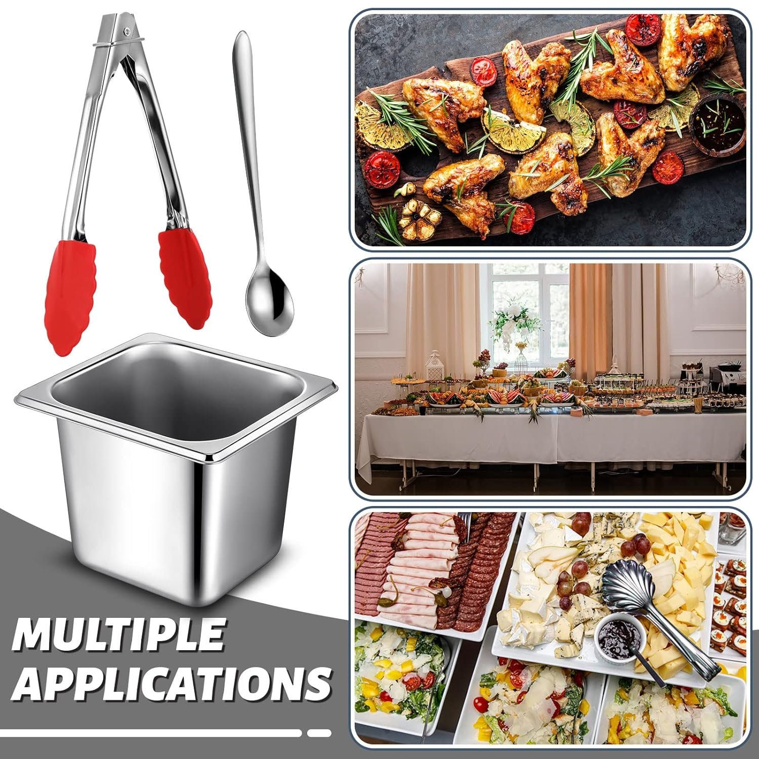 Package Contains: there are 16 pieces of 1/6 size hotel pans, 4 pieces of 6.3 inch stainless steel spoons and 2 pieces of 7 inch food tongs in the package, complete matching combination to meet your daily cooking and activity needs