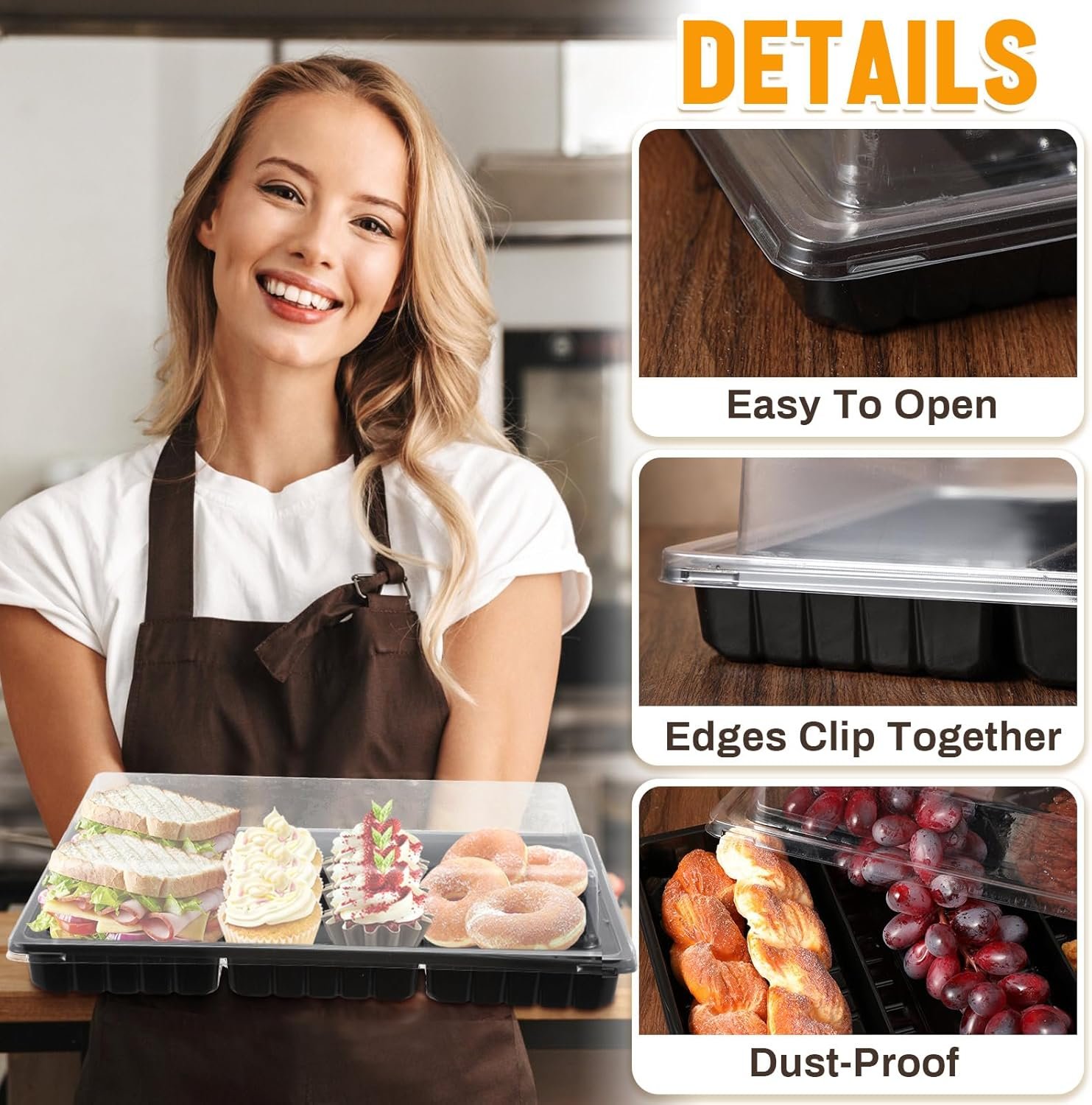 Generous Size for Use: these divided serving trays with lid come in a large size of 15 x 10 x 3.15 inches/ 38.1 x 25.4 x 8 cm, providing space for food; They are ideal for storing sandwiches, cakes, pastries, or other sweet treats and are suit for parties, catering, or even as a kitchen necessity