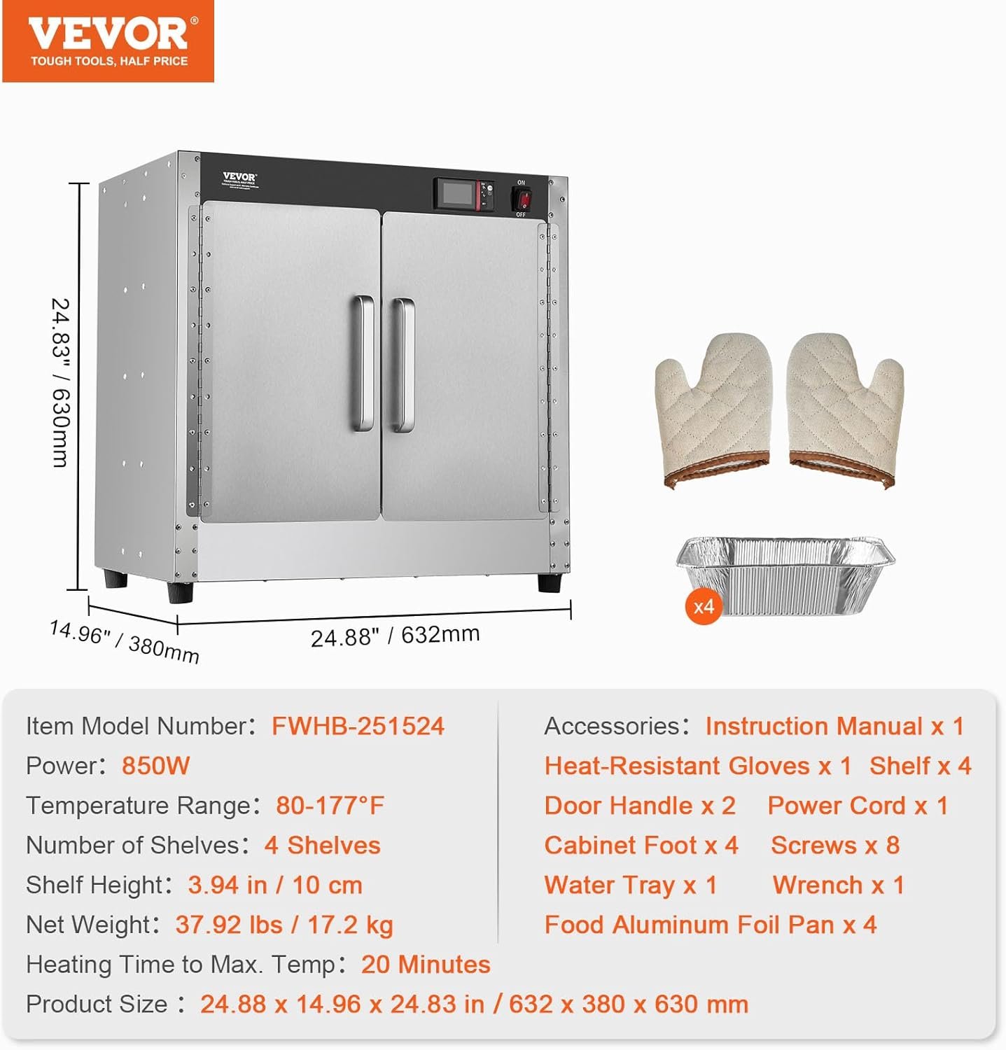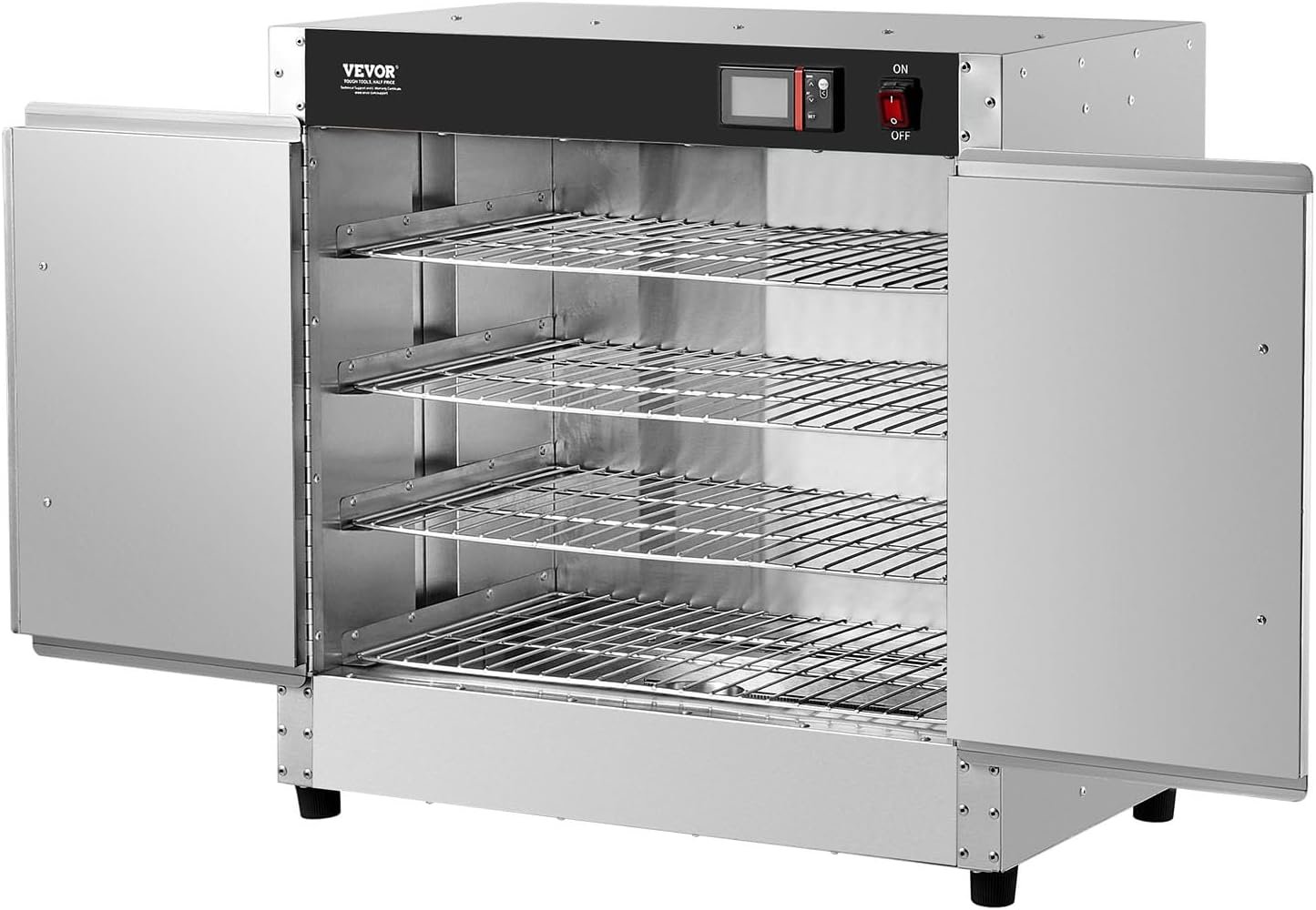 VEVOR Hot Box Food Warmer, 4-Tier Concession Warmer with Water Tray, 4 Pans, Double-Door and Adjustable Shelves, Stainless Steel Food Warmer Cabinet, Ideal for Storing Pizza, Chicken, Restaurant